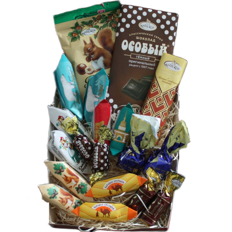 Конфеты кондитерской фабрики имени Крупской из Санкт-Петербурга. Шоколад Крупской фабрики ценят за особенный вкус, знакомый с детства. В наборе нет трюфеля особого, но мы планируем включить его в состав нового набора. Ленинградские конфеты пришлись по вкусу многим сладкоежкам, мы фиксируем множество положительных отзывов. Теперь нет необходимости искать фирменный магазин, можно заказать прямо из дома.