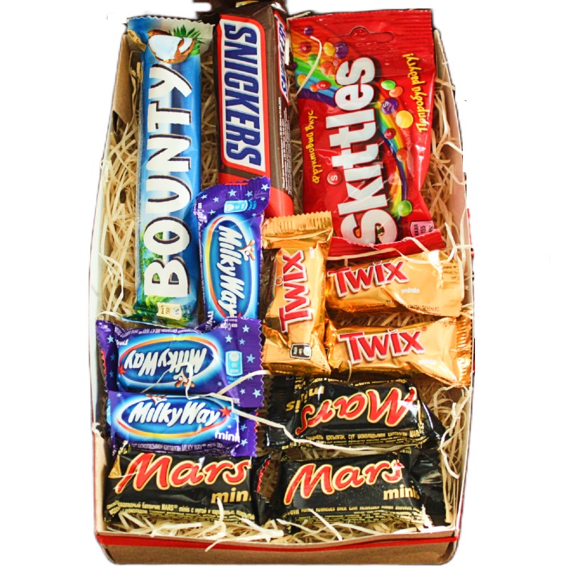 В состав набора входит 16 популярных сладостей: мини батончик Марс, шоколад Сникерс, мини Твикс, Баунти, мини Милки вей, конфеты Скитлс. Такой набор понравится как взрослым так и детям. Часто заказывают в школу одноклассникам как небольшой презент на день рождения, а также учителю и преподавателю. В детский сад можно выбрать для подарка одногруппникам или воспитателю.