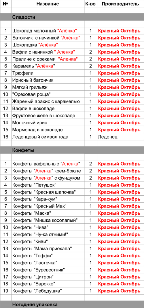 Шоколад молочный "Алёнка" (1 шт), Батончик  с начинкой "Алёнка" (1 шт), Шоколадка "Алёнка" (1 шт), Вафли с начинкой " Аленка" (2 шт), Пралине с орехами "Аленка" (2 шт), Карамель "Алёнка" (2 шт), Трюфели (1 шт), Ирисный батончик (1 шт), Мягкий грильяж (1 шт), "Ореховая роща" (1 шт), Жареный арахис с карамелью (1 шт), Вафли в шоколаде (1 шт), Фруктовое желе в шоколаде (1 шт), Молочный ирис (1 шт), Мармелад в шоколаде (1 шт), Конфеты вафельные "Аленка" (2 шт), Конфеты "Аленка" крем-брюле (2 шт), Конфеты "Аленка" с фундуком (2 шт), Конфеты "Петушок" (1 шт), Конфеты "Красная шапочка" (1 шт), Конфеты "Кара-кум" (1 шт), Конфеты "Красный Мак" (1 шт), Конфеты "Маска" (1 шт), Конфеты "Мишка косолапый" (1 шт), Конфеты "Нива" (1 шт), Конфеты "Ну-ка отними!" (1 шт), Конфеты "Киви" (1 шт), Конфеты "Мама приехала" (1 шт), Конфеты "Toффи" (1 шт), Конфеты "Ласточка" (1 шт), Конфеты "Буревестник" (1 шт), Конфеты "Цитрон" (1 шт), Конфеты "Барокко" (1 шт), Конфеты "Лебедушка" (1 шт)