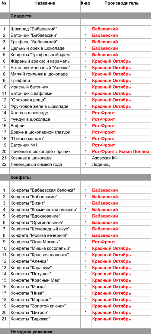 Конфеты "Огни Москвы" (1 шт), Халва в шоколаде (1 шт), Фундук в шоколаде (1 шт), Вафли (1 шт), Драже в шоколадной глазури (1 шт), "Птичье молоко" (1 шт), Батончик №1 (1 шт), Печенье в шоколаде / пряник (1 шт)